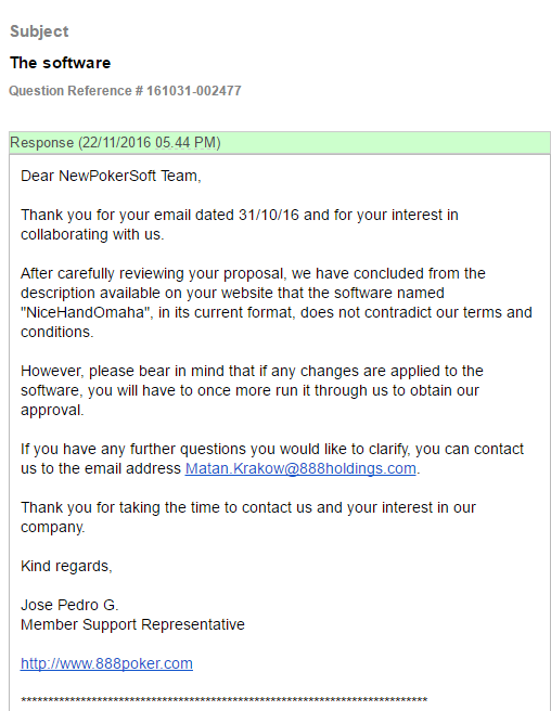 Also the tool supports 888Poker. There is a letter from 888Poker support that NiceHandOmaha does not contradict 888Poker term and conditions. That is screenshot. You need to install 888Caption from its website. The tool is free up to PLO 10.