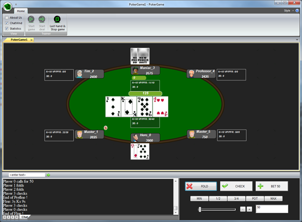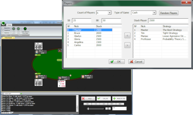 PokerGame – new poker simulator software or poker training software. By deciding to download it, you are taking the first step toward immensely expanding your poker knowledge and practice. While the game deals in Texas hold’em cash game. Poker is just like any job. Once you develop your own style, you should learn to read how your opponents play. In our game there are 4 opponent types now: the tighter player, the maniac, professor and master. You may choice players obviously or randomly. In the second case you do not know who is who. There are 3 statistics now PFR, VPIP and 3B for help you. Register and download ! We will send email to you when new release will be ready. Feel free to contact us for further information or comments.